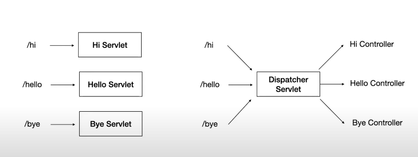 Servlet Container의 단점은, 동일한 uri에 대해 어떤 서비스 로직이 중복 되더라도 서로 다른 Servlet 객체들을 지정해줘야 한다는 비효율적인 측면이 있었다. 이를 DispatcherServlet을 사용하는 Spring 컨테이너와 결합하여 문제를 해결할 수 있다.